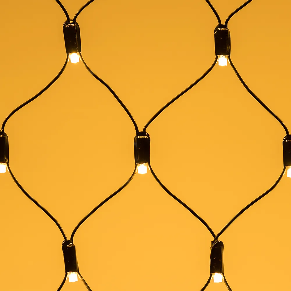 Светодиодная сеть Classic. 2500x2500 (длина 2500 мм, высота 2500 мм). Цвет свечения ТЕПЛЫЙ БЕЛЫЙ (3000 К). 432 светодиода размером 7 мм со статическим и 8 динамическими эффектами свечения с резким световым рисунком (прозрачная вогнутая линза). Провод черный, ПВХ. Питание 230 В, Мощность 26 Вт,защита IP65, применение в помещении и на улице под навесом Аксессуары для подключения и выбора режима свечения в комплекте.