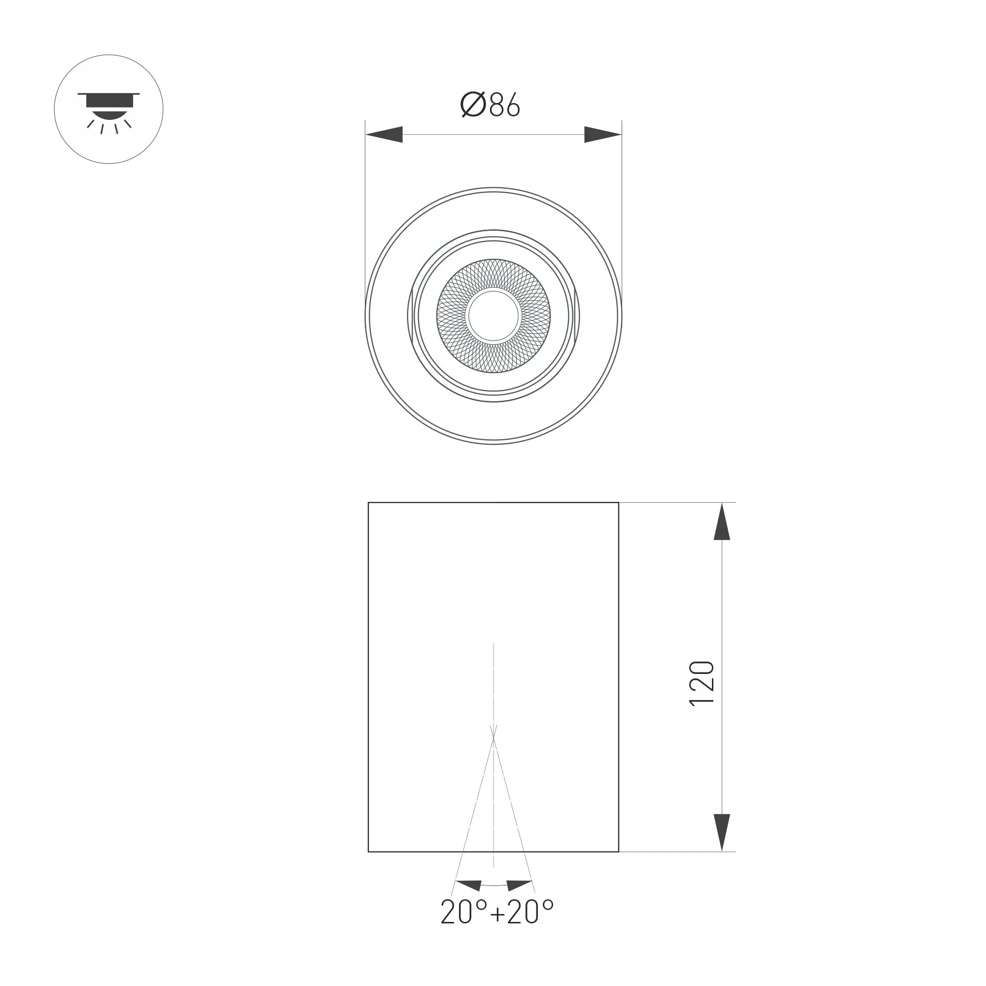 Накладной интерьерный светильник. Мощность 10 Вт, св. поток 970 лм, 93 лм/Вт, теплый 3000 K, CRI>90, угол 15°, регулируемое направление луча 40° (20+20), поворотный световой модуль вокруг своей оси на 340°, UGR <18, напряжение питания 230 В. Черный круглый корпус из алюминия, степень защиты IP54. Размер: диаметр 86,5 мм, высота 120 мм. Монтаж накладной. Драйвер 27-43 В, 250 мА, пульсация <1%.