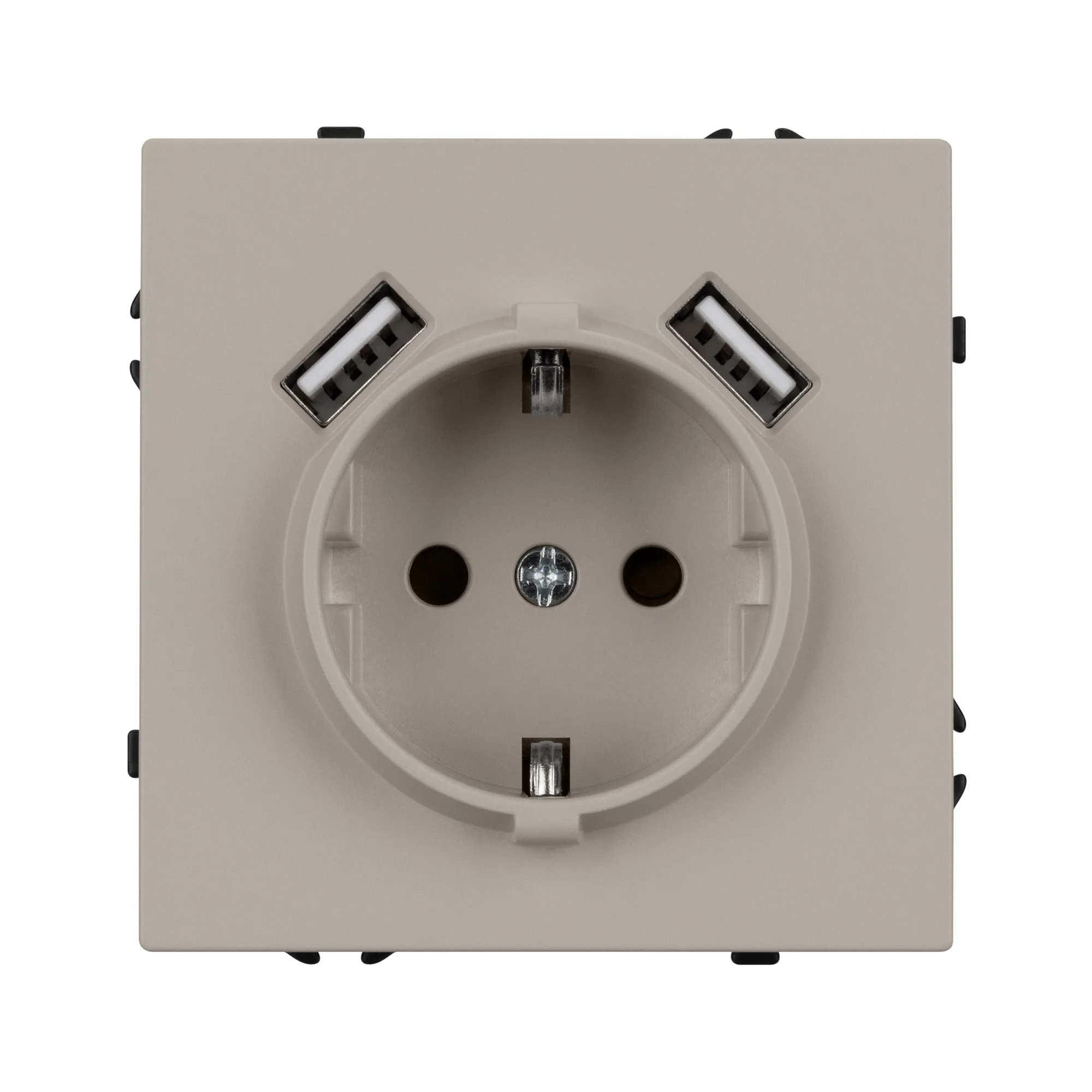 Механизм розетки с заземлением на 1 пост и 2USB Type A порта. Цвет - кашемир, с Soft-Touch поверхностью. Без фронтальной рамки. Уровень пылевлагозащиты IP20. Розетка устанавливается в стандартный подрозетник круглого сечения диаметром 60мм. Габаритные размеры: длина 71 мм, ширина 71 мм, высота 53 мм. Гарантийный срок 10 лет.